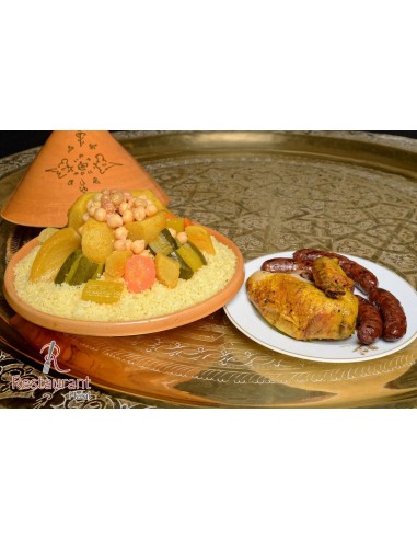Couscous trois viandes . Bouillon, semoule, viandes servis séparémentVoir description détaillée et composition ci-dessous.