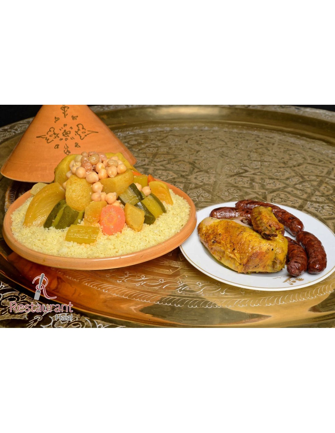 Couscous Poulet, Bouillon, semoule, Poulet servis séparémentVoir description détaillée et composition ci-dessous.